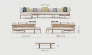L’ensemble d’extérieur Dominica en U+TB a été conçu pour offrir une expérience de détente exceptionnelle en plein air. Son rembourrage associe mousse D33, MG4000, Souplesse et ABS, complété par une ouate de 300 g, garantissant une assise accueillante et un maintien optimal. Son tissu imperméable protège efficacement contre les intempéries, faisant de cet ensemble un allié idéal pour profiter durablement de votre terrasse ou jardin.