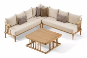 Le salon d’extérieur Lary de Sketch Design propose des meubles de jardin élégants et confortables. Les fauteuils de ce salon sont fabriqués avec une structure en bois de hêtre massif, une mousse haute résilience pour un confort optimal et un tissu imperméable qui garantit une durabilité à toute épreuve. Parfaits pour votre espace extérieur, ces meubles allient style et praticité.