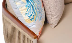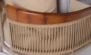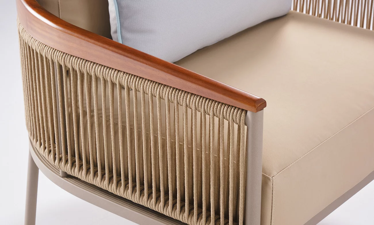 Les matelas D33/8 et HR35 offrent une assise agréable avec une souplesse bleue propice à la détente, renforcée par une bande D22/2 et un garnissage en ouate 300 pour un maintien équilibré. Pour mettre en valeur l’ensemble, privilégiez des coussins aux tons clairs ou minéraux, ajoutez une table basse en matière naturelle et intégrez quelques plantes en pots pour créer une atmosphère chaleureuse et accueillante, parfaitement adaptée à un espace extérieur convivial.