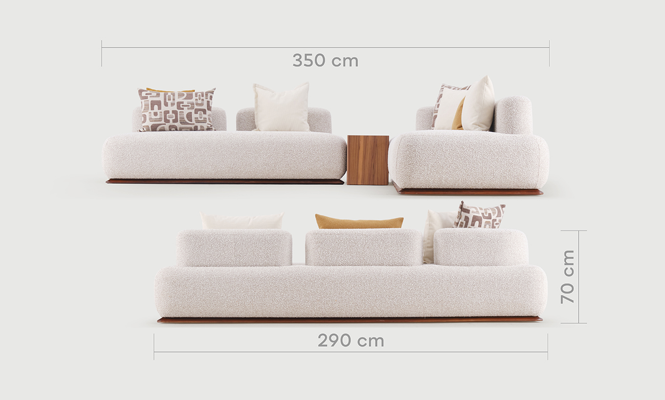 Sa structure en bois massif offre une stabilité et longévité incomparables, tandis que le socle en hêtre massif teinté noyer apporte une touche naturelle et raffinée. Pour mettre en valeur ce salon, vous pouvez associer des coussins aux tons chauds ou pastel, ou poser un tapis clair en dessous pour créer un contraste élégant. Les plaids légers et accessoires en matériaux naturels viendront compléter l’ensemble, donnant à votre espace un aspect convivial et harmonieux.