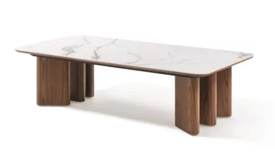 La structure en bois de la table Rocks, habillée d’un bardage en noyer massif, ajoute de la profondeur et une dimension chaleureuse à son design. Le contraste entre la céramique et le noyer massif crée une harmonie parfaite, alliant robustesse et style. Pour sublimer cette table, optez pour des accessoires minimalistes, comme des vases en verre ou des bougies parfumées, qui viendront renforcer l’élégance naturelle de l’ensemble tout en apportant une touche de sérénité à votre espace.