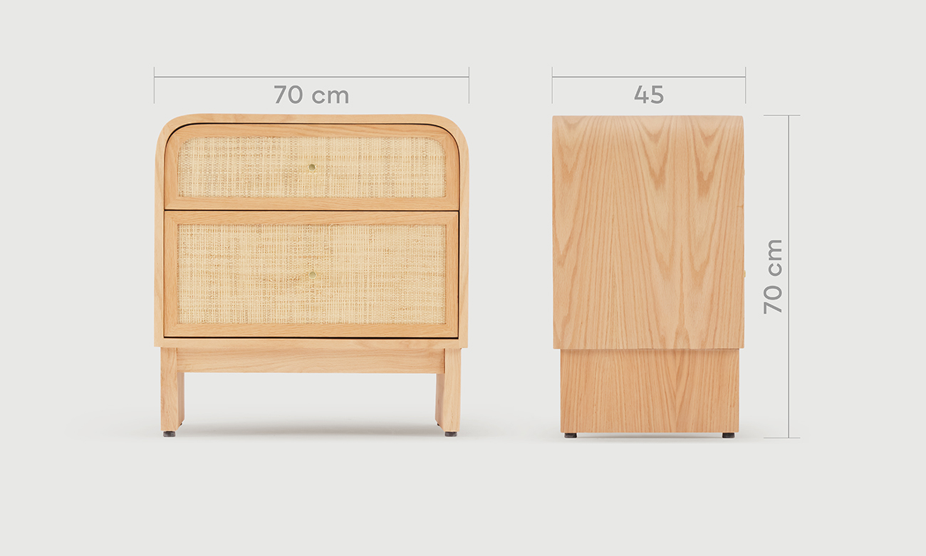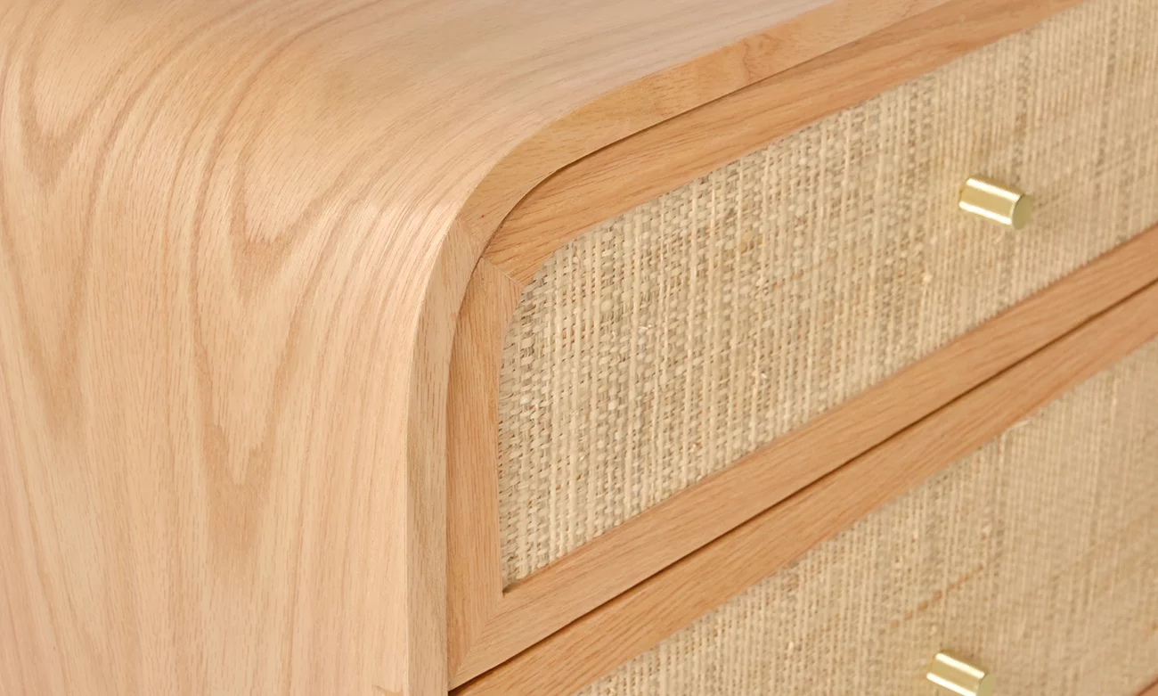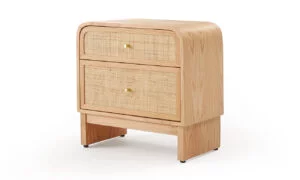 La face de tiroir en rabane confère à la table de chevet Shiloh une touche artisanale pleine de charme. Cette matière naturelle ajoute du relief et crée un contraste subtil avec la structure, pour un rendu visuel captivant. Pour la mettre en valeur, associez-la à une lampe en céramique texturée ou à un luminaire en fibres naturelles afin de renforcer l’esprit organique. Complétez l’ensemble avec du linge de lit aux tons neutres ou terreux et quelques accessoires en rotin ou en lin pour composer une atmosphère accueillante et équilibrée.