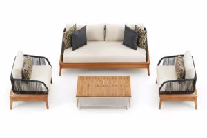 L’ensemble d’extérieur 3+1+1+TB Sydney est l’ultime fusion de confort et de durabilité pour vos espaces extérieurs. Avec une structure en bois Irokko et une finition laquée synthétique résistante à l’usure, cet ensemble allie style et robustesse pour faire face aux éléments extérieurs. La mousse HR et les éléments ABS garantissent un confort optimal, vous permettant de vous détendre en toute sérénité dans votre jardin ou sur votre terrasse, que ce soit pour un moment de lecture tranquille ou pour accueillir des invités en plein air.